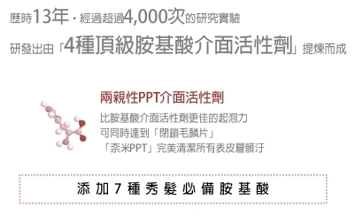 ◎ 研發歷經13年,超過4,000次的研究實驗,獨家研發兩親性PPT介面活性劑,並添加7種秀髮必備胺基酸,可達到幾近閉鎖毛鱗片清潔,有效維持頭髮光澤和染後顯色度,洗髮後完美恢復秀髮柔軟度